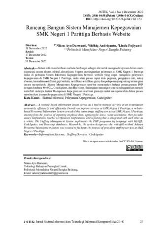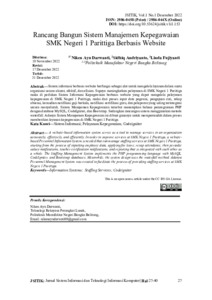 Sistem informasi berbasis website berfungsi sebagai alat untuk mengelola layanan dalam suatu organisasi secara akurat, efektif, dan efisien. Supaya meningkatkan pelayanan di SMK Negeri 1 Parittiga maka di perlukan Sistem Informasi Kepegawaian berbasis website yang dapat mengelola pelayanan kepegawaian di SMK Negeri 1 Parittiga, mulai dari proses input data pegawai, pengajuan cuti, rekap absensi, kemudian notifikasi gaji berkala, notifikasi sertifikasi guru, dan pelaporan yang saling terintegrasi secara menyeluruh. Sistem Manajemen Kepegawaian tersebut menerapkan bahasa pemrograman PHP dengan database MySQL, CodeIgniter, dan Bootstrap. Sedangkan rancangan sistem menggunakan metode waterfall. Adanya Sistem Manajemen Kepegawaian ini dibuat gunanya untuk mempermudah dalam proses memberikan layanan kepegawaian di SMK Negeri 1 Parittiga.