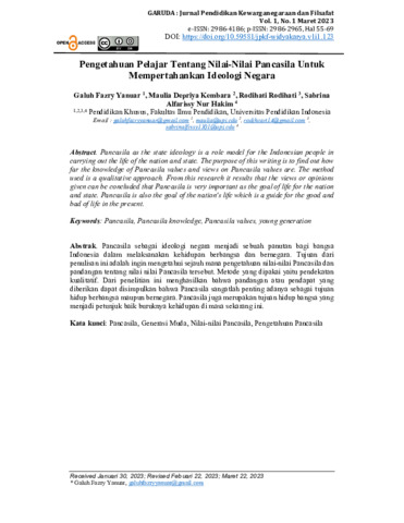 Galuh, Fazry Yanuar and Maulia, Depriya Kembara and Rodihati, Rodihati and Sabrina, Alfarissy Nur Hakim Pengetahuan pelajar tentang nilai-Nilai Pancasila untuk mempertahankan Ideologi Negara. Jurnal Pendidikan Kewarganegaraan dan Filsafat, 1 (1). ISSN 2986-2965