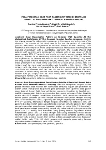 Annisa, Primadiamanti and Gusti Ayu Rai, Saputri and Surya Mega, Utami and Dwi, Susanti (2023) Pola peresepan obat pada pasien gastritis di instalasi rawat jalan rumah sakit Imanuel Bandar Lampung. Jurnal Medika Malahayati, 7 (2): 17. 716 -727. ISSN 2355-6757