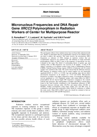 Dwi, Ramadhani and Yanti, Lusiyanti and Mukh, Syaifudin (2018) Micronucleus Frequencies and DNA Repair Gene XRCC3 Polymorphism in Radiation Workers of Center for Multipurpose Reactor. Atom Indonesia, 44 (1). pp. 43-48. ISSN 0126-1568