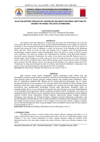 Suud, Sarim Karimullah (2022) Re-actualization thought KH. Hasyim Asy'ari about national unity and its urgency in facing the Covid-19 pandemic. Inovasi: Jurnal Sosial Humaniora Dan Pendidikan, 1 (1): 2. pp. 10-15. ISSN 2809-0403