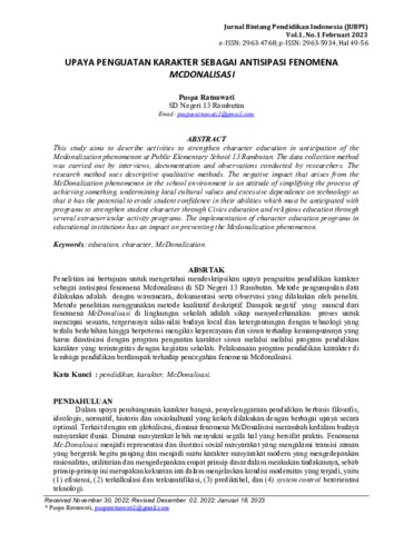 Penelitian ini bertujuan untuk mengetahui mendeskripsikan upaya penguatan pendidikan karakter sebagai antisipasi fenomena Mcdonalisasi di SD Negeri 13 Rambutan. Metode pengumpulan data dilakukan adalah dengan wawancara, dokumentasi serta observasi yang dilakukan oleh peneliti. Metode penelitian menggunakan metode kualitatif deskriptif. Dampak negatif yang muncul dari fenomena McDonalisasi di lingkungan sekolah adalah sikap menyederhanakan proses untuk mencapai sesuatu, tergerusnya nilai-nilai budaya local dan ketergantungan dengan tehnologi yang terlalu berlebihan hingga berpotensi mengikis kepercayaan diri siswa terhadap kemampuannya yang harus diantisiasi dengan program penguatan karakter siswa melalui melalui program pendidikan karakter yang terintegritas dengan kegiatan sekolah. Pelaksanaan program pendidikan katrakter di lembaga pendidikan berdampak terhadap pencegahan fenomena Mcdonalisasi.