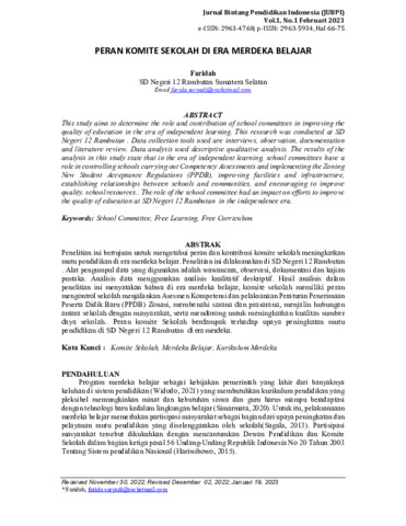Faridah, Faridah (2023) Peran komite sekolah di era merdeka belajar. Jurnal Bintang Pendidikan Indonesia, 1 (1): 8. pp. 66-75. ISSN 2963-5934