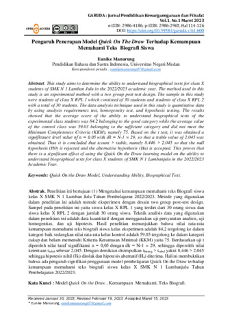 Penelitian ini bertujuan (1) Mengetahui kemampuan memahamiteks Biografi siswa kelas X SMK N 1 Lumban Julu Tahun Pembelajaran 2022/2023. Metode yang digunakan dalam penelitian ini adalah metode eksperimen dengan desain two group post-test design. Sampel pada penelitian ini yaitu siswa kelas X RPL 1 yang terdiri dari 30 orang siswa dan siswa kelas X RPL 2 dengan jumlah 30 orang siswa. Teknik analisis data yang digunakan dalam penelitian ini adalah data kuantitatif dengan menggunakan uji persyaratan analisis, uji homogenitas, dan uji hipotesis. Hasil penelitian menunjukkan bahwa nilai rata-rata kemampuan memahami teks biografi siswa kelas eksperimen adalah 84,2 tergolong ke dalam kategori baik sedangkan nilai rata-rata kelas kontrol adalah 59.03 tergolong ke dalam kategori cukup dan belum memenuhi Kriteria KetuntasanMinimal (KKM) yaitu 75. Berdasarkan uji t diperoleh nilai taraf signifikansi α = 0,05 dengan dk = N-1 = 29, sehingga diperoleh nilai ketentuan ttabel sebesar 2,045. Dengan demikian disimpulkan thitung> ttabelyakni 8,446> 2,045sehingga hipotesis nihil (H0) ditolak dan hipotesis alternatif (Ha) diterima. Hal ini membuktikan bahwa ada pengaruh signifikan penggunaan model pembelajaranQuick On the Draw terhadap kemampuan memahami teks biografi siswa kelas X SMK N 1 Lumbanjulu Tahun Pembelajaran 2022/2023.