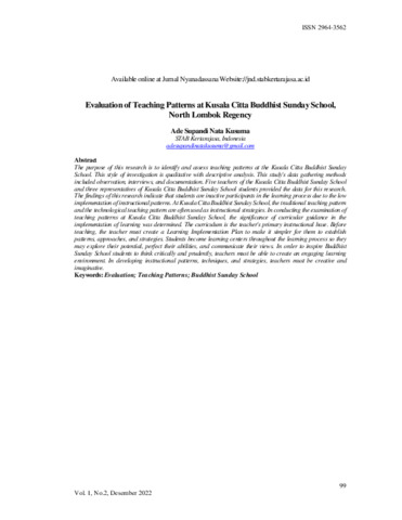 Ade Supandi Nata, Kusuma (2022) Evaluation of teaching patterns at Kusala Citta Buddhist Sunday School, North Lombok Regency. Jurnal Nyanadassana: Jurnal Penelitian Pendidikan, Sosial dan Keagamaan, 1 (2): 2. pp. 99-106. ISSN 2964-3562