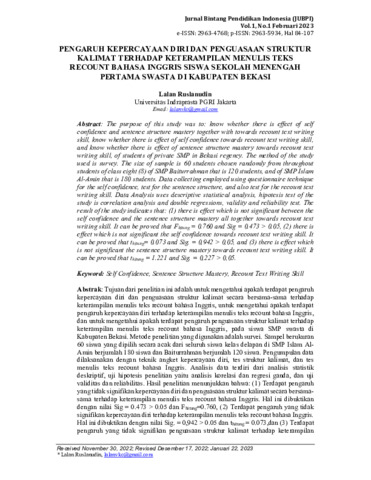 Lalan, Ruslanudin (2023) Pengaruh kepercayaan diri dan penguasaan struktur kalimat terhadap keterampilan menulis teks recount bahasa Inggris siswa Sekolah Menengah Pertama swasta di Kabupaten Bekasi. Jurnal Bintang Pendidikan Indonesia, 1 (1): 10. pp. 84-107. ISSN 2963-5934