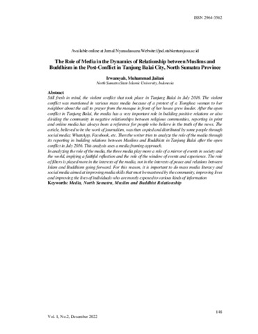 Still fresh in mind, the violent conflict that took place in Tanjung Balai in July 2016. The violent conflict was mentioned in various mass media because of a protest of a Tionghoa woman to her neighbor about the call to prayer from the mosque in front of her house grew louder. After the open conflict in Tanjung Balai, the media has a very important role in building positive relations or also dividing the community in negative relationships between religious communities, reporting in print and online media has always been a reference for people who believe in the truth of the news. The article, believed to be the work of journalism, was then copied and distributed by some people through social media; WhatsApp, Facebook, etc. Then the writer tries to analyze the role of the media through its reporting in building relations between Muslims and Buddhists in Tanjung Balai after the open conflict in July 2016. This analysis uses a media framing approach. In analyzing the role of the media, the three media play more a role of a mirror of events in society and the world, implying a faithful reflection and the role of the window of events and experience. The role of filters is played more in the interests of the media, not in the interests of peace and relations between Islam and Buddhism going forward. For this reason, it is important to do mass media literacy and social media aimed at improving media skills that must be mastered by the community, improving lives and improving the lives of individuals who are mostly exposed to various kinds of information.