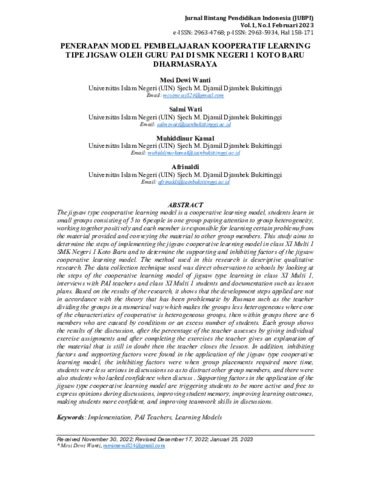 Mesi, Dewi Wanti and Salmi, Wati and Muhiddinur, Kamal and Afrinaldi, Afrinaldi (2023) Penerapan model pembelajaran kooperatif learning tipe jigsaw oleh guru pai di SMK Negeri 1 Koto Baru Dharmasraya. Jurnal Bintang Pendidikan Indonesia, 1 (1): 14. pp. 158-171. ISSN 2963-5934