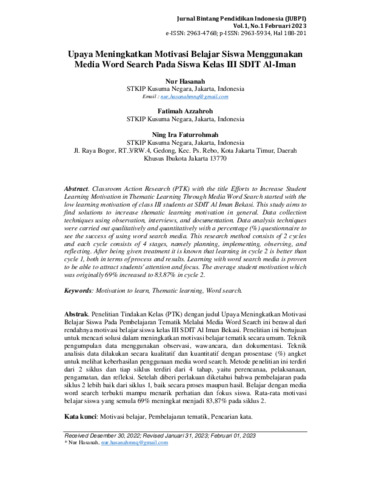 Penelitian Tindakan Kelas (PTK) dengan judul Upaya Meningkatkan Motivasi Belajar Siswa pada Pembelajaran Tematik Melalui Media Word Search ini berawal dari rendahnya motivasi belajar siswa kelas III SDIT Al Iman Bekasi. Penelitian ini bertujuan untuk mencari solusi dalam meningkatkan motivasi belajar tematik secara umum. Teknik pengumpulan data menggunakan observasi, wawancara, dan dokumentasi. Teknik analisis data dilakukan secara kualitatif dan kuantitatif dengan kuesioner persentase (%) angket untuk melihat keberhasilan penggunaan media word search. Metode penelitian ini terdiri dari 2 siklus dan setiap siklus terdiri dari 4 tahap yaitu perencanaan, pelaksanaan, observasi, dan refleksi. Setelah diberikan perlakuan diketahui bahwa pembelajaran pada siklus 2 lebih baik dibandingkan siklus 1 baik dari segi proses maupun hasil. Belajar dengan media word search terbukti mampu menarik perhatian dan fokus siswa. Rata-rata motivasi belajar siswa yang semula 69% meningkat menjadi 83,87% pada siklus 2.