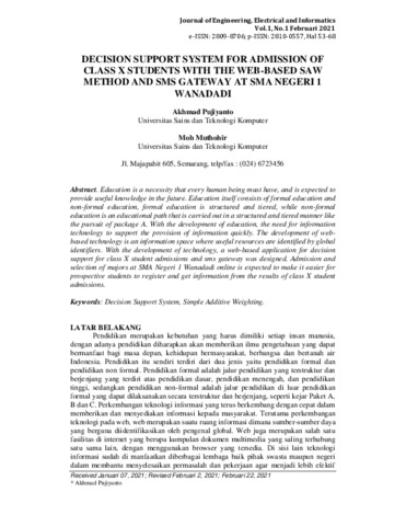 Akhmad, Pujiyanto and Moh, Muthohir (2021) Decision support system for admission of class X students with the web-based saw method and SMS gateway at SMA Negeri 1 Wanadadi. Journal of Engineering, Electrical and Informatics, 1 (1): 5. pp. 53-68. ISSN 2810-0557
