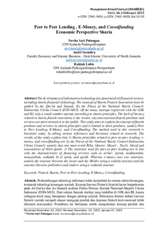Novita, Sari Pulungan and Andri, Soemitra and Rukiah, Lubis (2023) Peer to peer lending, e-money, and crowdfunding economic perspective sharia. Manajemen Kreatif Jurnal, 1 (1): 2. pp. 10-30. ISSN 2963-9638