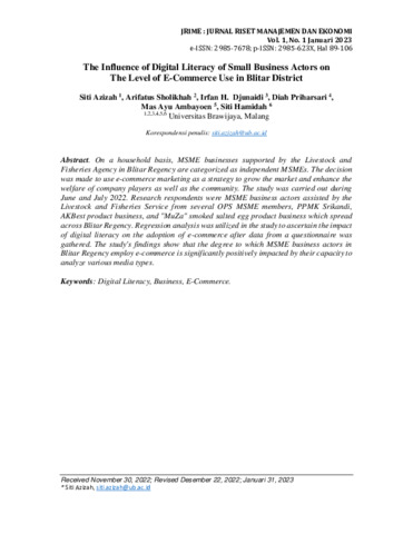 Siti, Azizah and Arifatus, Sholikhah and Irfan, H. Djunaidi and Diah, Priharsari and Mas, Ayu Ambayoen and Siti, Hamidah (2023) The influence of digital literacy of small business actors on the level of e-commerce use in Blitar district. Jurnal Riset Manajemen dan Ekonomi, 1 (1). pp. 89-106. ISSN 2985-623X