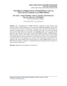On a household basis, MSME businesses supported by the Livestock and Fisheries Agency in Blitar Regency are categorized as independent MSMEs. The decision was made to use e-commerce marketing as a strategy to grow the market and enhance the welfare of company players as well as the community. The study was carried out during June and July 2022.Researchrespondents were MSME business actors assisted by the Livestock and Fisheries Service from several OPS MSME members, PPMK Srikandi, AKBest product business, and "MuZa" smoked salted egg product business which spreada cross Blitar Regency. Regression analysis was utilized in the study to ascertain the impactof digital literacy on the adoption of e-commerce after data from a questionnaire was gathered. The study's findings show that the degree to which MSME business actors inBlitar Regency employ e-commerce is significantly positively impacted by their capacity to analyze various media types.