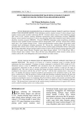 STUDI PRODUKSI RADIOISOTOP Mo-99 DENGAN BAHAN TARGET LARUTAN URANIL NITRAT PADA REAKTOR KARTINI. Telah dilakukan analisis simulasi larutan U-nitrat sebagai target iradiasi neutron untuk produksi radioisotop Mo-99. Uranium dalam senyawa nitrat diperkaya dengan 20% berat U-235. Analisis simulasi dilakukan berdasarkan pada perhitungan program ORIGEN2 dimana variasi simulasi konsentrasi U-nitrat yang diuraikan dalam data komposisi unsur dalam larutan dijadikan masukan program ORIGEN2. Program ORIGEN2 digunakan untuk menghitung perubahan komposisi unsur apabila larutan teriradiasi neutron dengan fluks 5x1011 n/cm2det dengan lama iradiasi mulai dari 1 hari sampai dengan 8 hari. Untuk menyederhanakan analisis dibuat representasi grafis terhadap hasil perhitungan terhadap parameter K~, Energi fisi, radioaktivitas MO-99 dan kontur peluruhan Mo setelah selesai iradiasi. Dari hasil analisis simulasi dapat disimpulkan bahwa radioisotop Mo-99 dapat diproduksi dengan melalui iradiasi larutan U-nitrat 102 g/l dengan uranium diperkaya 20% berat U-235 pada reaktor Kartini. Produksi yang dapat dicapai adalah 3.23 Ci Mo-99 per 300 cc larutan dengan lama iradiasi 5 hari. Daya thermal yang dibangkitkan dalam larutan selama proses iradiasi sebesar 89.3 watt didinginkan oleh sistem sirkulasi air kolam reaktor.