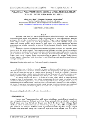 | Uncontrolled Keywords: | Salatiga, Pelayanan Prima , Pariwisata, Pengabdian masyarakat, Tourist, Quality of services, Salatiga, Community services |