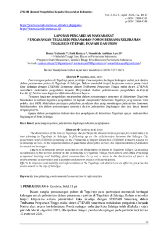 Henry, Yuliamir and Enik, Rahayu and Wenefrida, Ardhian Ayu H (2022) Laporan pengabdian masyarakat pencanangan Tegalrejo penanaman pohon bersama Kelurahan Tegalrejo STIEPARI, IKAPARI dan UKSW. Jurnal Pengabdian kepada Masyarakat Indonesia (JPKMI), 2 (1): 3. pp. 10-13. ISSN 2809-9311