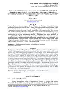 Pengaruh Kejelasan Sasaran Anggaran Sistem Pelaporan dan Partisipasi Masyarakat Terhadap Akuntabilitas Pengelolaan Dana Desa pada Lembang Salu Sarre Kecamatan Sopai Kabupaten Toraja Utara”. Penelitian ini bertujuan untuk mengetahui Pengaruh Kejelasan Sasaran Anggaran, Sistem Pelaporan dan Partisipasi Masyarakat Terhadap Akuntabilitas Pengelolaan Dana Desa pada Lembang Salu Sarre Kecamatan Sopai Kabupaten Toraja Utara. Sampel penelitian ini adalah 500 orang dengan jumlah responden 83 orang. Metode penentuan sampel menggunakan metode Purposive Sampling dan pengumpulan data dengan menggunakan kuesioner. Berdasarkan hasil dalam penelitian ini menunjukkan bahwa Kejelasan Sasaran Anggaran, Sistem Pelaporan dan Partisipasi masyarakat berpengaruh positif dan signifikan terhadap Akuntabilitas Pengelolaan Dana Desa. Dengan hasil Uji-t menunjukkan bahwa Kejelasan Sasaran Anggaran memiliki nilai signifikan sebesar 0,006, Sistem Pelaporan dengan nilai signifikan sebesar 0,000 serta Partisipasi Masyarakat memiliki nilai signifikan 0,007. Kemudian dari hasil Uji- F dengan nilai signifikan 0,000.