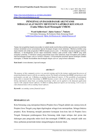 Wyati, Saddewisasi and Djoko, Santoso and Indarto, Indarto (2022) Pengenalan dasar-dasar akuntansi sebagai alat bantu menyusun laporan keuangan (Usaha Mikro Kecil Menengah/UMKM). Jurnal Pengabdian kepada Masyarakat Indonesia (JPKMI), 2 (1): 9. pp. 55-62. ISSN 2809-9311