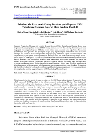 Elmira, Siska and Nurlaela, Eva Puji Lestari and Lela, Elvira and Siti, Mabrur Rachmah (2022) Pelatihan ms. excel untuk pricing decisions pada koperasi UKM Tajurhalang Makmur Bogor di masa pandemi Covid-19. Jurnal Pengabdian kepada Masyarakat Indonesia (JPKMI), 2 (1): 10. pp. 63-72. ISSN 2809-9311