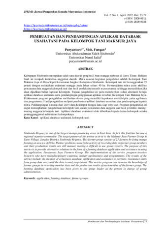 Puryantoro, Puryantoro and Moh., Furqan (2022) Pembuatan dan pendampingan aplikasi database usahatani pada Kelompok Tani Makmur Jaya. Jurnal Pengabdian kepada Masyarakat Indonesia (JPKMI), 2 (1): 11. pp. 73-79. ISSN 2809-9311