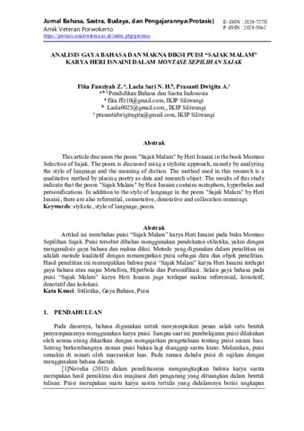 Artikel ini membahas puisi “Sajak Malam” karya Heri Isnaini pada buku Montase Sepilihan Sajak. Puisi tersebut dibahas menggunakan pendekatan stilistika, yakni dengan menganalisis gaya bahasa dan makna diksi. Metode yang digunakan dalam penelitian ini adalah metode kualitatif dengan menempatkan puisi sebagai data dan objek penelitian. Hasil penelitian ini menunjukkan bahwa puisi “Sajak Malam” karya Heri Isnaini terdapat gaya bahasa atau majas Metafora, Hiperbola dan Personifikasi. Selain gaya bahasa pada puisi “Sajak Malam” karya Heri Isnaini juga terdapat makna referensial, konotatif, denotatif dan kolokasi.