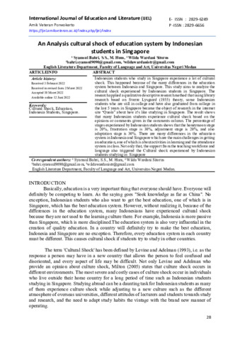Syamsul, Bahri and Wilda, Wardani Sitorus (2022) An analysis cultural shock of education system by Indonesian students in Singapore. International Journal of Education and Literature, 1 (1): 3. pp. 28-42. ISSN 2829-6656