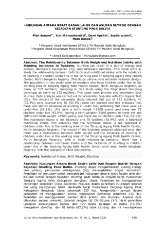 Pitri, Subani and Yuni, Ramadhaniati and Dewi, Aprilia and Susilo, wulan and Meta, Kosasi (2022) Hubungan antara berat badan lahir dan asupan nutrisi dengan kejadian Stunting pada Balita. Jurnal Ilmu Kedokteran dan Kesehatan, 9 (1). pp. 1-8. ISSN 2549-4864