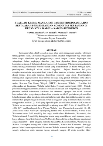 Wa, Ode Alzarliani and Sri, Yuniati and Wardana, Wardana and Musrif, Musrif (2023) Evaluasi kesesuaian lahan dan ketersediaan lahan serta arah pengembangan komoditas pertanian di Kecamatan Wabula Kabupaten Buton. Jurnal Penelitian, Pengembangan dan Inovasi Daerah, 1 (1): 3. pp. 30-43. ISSN 2988-4233