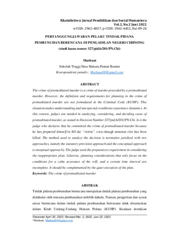 Markuat, Markuat (2022) Pertanggungjawaban pelaku tindak pidana pembunuhan berencana di Pengadilan Negeri Cibinong (Studi kasus nomor 327/pid.b/201/PN.Cbi). Khatulistiwa: Jurnal Pendidikan dan Sosial Humaniora, 2 (2): 2. pp. 9-26. ISSN 2962-4452