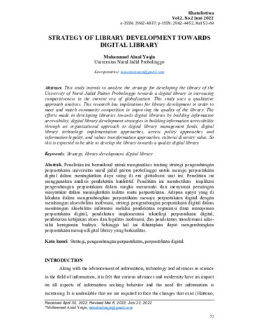 Muhammad, Ainul Yaqin (2022) Strategy of library development towards digital library. Khatulistiwa: Jurnal Pendidikan dan Sosial Humaniora, 2 (2): 5. pp. 52-69. ISSN 2962-4452