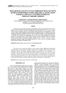 Angelina, Putri and Carmenita, Suhartono and Monika, Kristanti (2023) Pengaruh kualitas layanan terhadap minat kunjung kembali di restoran Kaizen BBQ Grill & Shabu-Shabu Surabaya dengan customer experience sebagai variabel mediasi. Jurnal Manajemen Perhotelan, 9 (1). pp. 46-54. ISSN 0216-6283