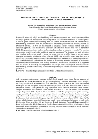 Suyanti, Suwardi and Ivansri Marsaulina,, Marsaulina, and Novy Ramini Harahap, Ramini Harahap and Yuliana, Yuliana (2023) Hubungan teknik menyusui dengan kelancaran produksi ASI pada ibu menyusui di Dermawati Medan. Indonesian Trust Health Journal, 6 (1): 4. pp. 20-28. ISSN 2620-5564