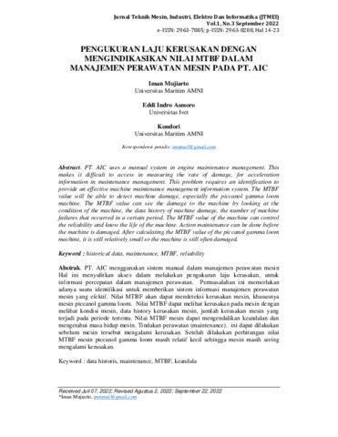 Iman, Mujiarto and Eddi, Indro Asmoro and Kundori, Kundori (2022) Pengukuran laju kerusakan dengan mengindikasikan nilai MTBF dalam manajemen perawatan mesin pada PT. AIC. Jurnal Teknik Mesin, Industri, Elektro dan Informatika, 1 (3): 2. pp. 14-23. ISSN 2963-8208