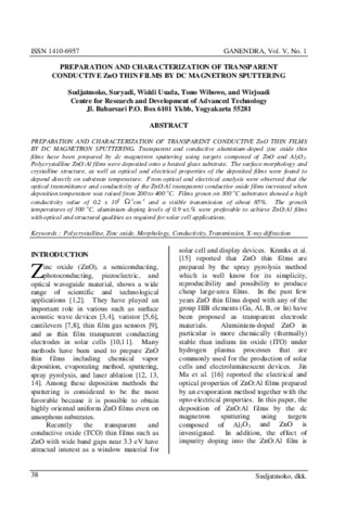 Sudjatmoko, sudjatmoko and Suryadi, Suryadi and Usada, Widdi and Wibowo, Toni and Wirjoadi, wirjoadi (2002) PREPARATION AND CHARACTERIZATION OF TRANSPARENT CONDUCTIVE ZnO THIN FILMS BY DC MAGNETRON SPUTTERING. Ganendra, 5 (1). pp. 38-42. ISSN p-ISSN: 1410-6957, e-ISSN: 2503-5029