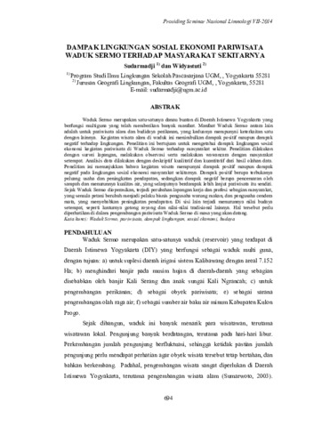 Sudarmadji, Sudarmadji and Widyastuti, Widyastuti (2015) Dampak lingkungan sosial ekonomi pariwisata Waduk Sermo terhadap masyarakat sekitarnya. In: Prosiding Seminar Nasional Limnologi VII, 16 Sep 2014, Gedung APCE, Cibinong Science Centre-Botanical Garden.