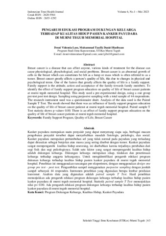 Desni, Vidensia Lase and Muhammad, Taufik Daniel Hasibuan (2023) Pengaruh edukasi program dukungan keluarga terhadap kualitas hidup pasien kanker payudara di Murni Teguh Memorial hospital. Indonesian Trust Health Journal, 6 (1). pp. 63-69. ISSN 2620-5564