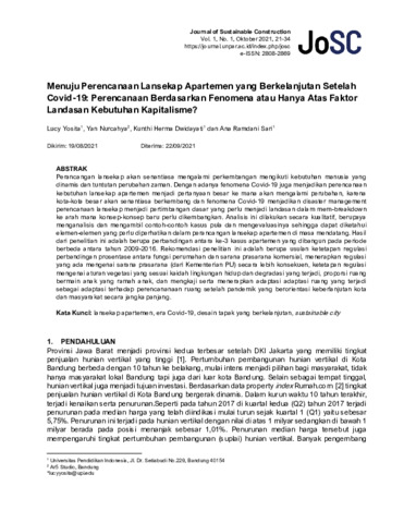 Lucy, Yosita and Yan, Nurcahya and Kunthi, Herma Dwidayati and Ana R, Ana R (2021) Menuju perencanaan lansekap apartemen yang berkelanjutan setelah Covid-19: perencanaan berdasarkan fenomena atau hanya atas faktor landasan kebutuhan kapitalisme? Journal of Sustainable Construction (JoSC), 1 (1): 3. pp. 21-34. ISSN 2808-2869