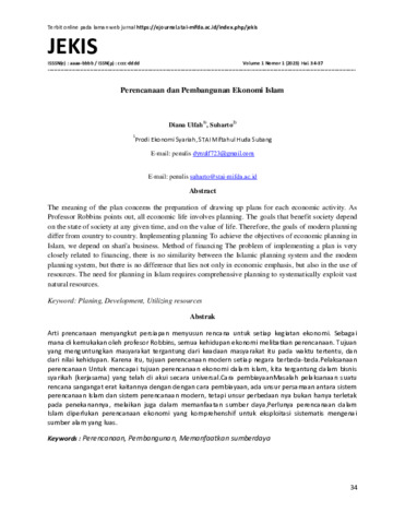 Diana, Ulfah and Suharto, Suharto (2023) Perencanaan dan Pembangunan Ekonomi Islam. Jurnal Ekonomi Islam, 1 (1). pp. 34-37. ISSN 2987-8675