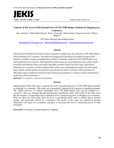 Ikna, mubarok and Delis, khulud fitriani and Rizky, Alamsyah and Budi, sudrajat and Henny, saraswati and Wahyu, Hidayat (2023) Analysis of the level of purchasing power of uin smh banten students in shopping at Ecommerce. Jurnal Ekonomi Islam, 1 (1). pp. 84-92. ISSN 2987-8675
