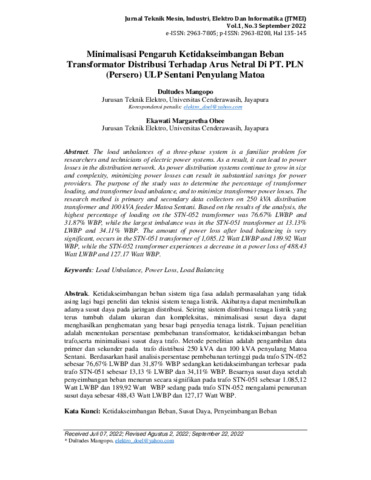 Dultudes, Mangopo and Ekawati, Margaretha Ohee (2022) Minimalisasi pengaruh ketidakseimbangan beban transformator distribusi terhadap arus netral di PT. PLN (Persero) ULP Sentani Penyulang Matoa. Jurnal Teknik Mesin, Industri, Elektro dan Informatika, 1 (3): 12. pp. 135-145. ISSN 2963-8208