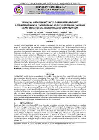 Silvester, A.S. Herjuna and Ghulam, A. Fatoni and Ahmaddin, Yakub (2022) Penerapan algoritma Naïve Bayes Classifier menggunakan R-programming untuk pengelompokan jenis keluhan aplikasi PLN mobile secara otomatis guna meningkatkan kepuasan pelanggan. Jurnal Informatika dan Tekonologi Komputer, 2 (1): 3. pp. 19-30. ISSN 2809-9249