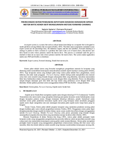 Sugiarto, Sugiarto and Purwanto, Purwanto (2022) Perancangan sistem pendukung keputusan diagnosa kerusakan sepeda motor matic Honda Beat menggunakan metode forward chaining. Jurnal Publikasi Manajemen Informatika, 1 (1): 3. pp. 18-28. ISSN 808-9359