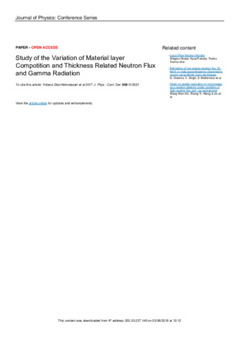 Nirmalasari, YD and Suparmi, Suparmi and Sardjono, Yohanes (2017) Study of the Variation of Material layer Compotition and Thickness Related Neutron Flux and Gamma Radiation. Optimation of simulation design of collimator is corresponding to 30 MeV cyclotron generator. The simulation has used the variation of the thickness materials layers that was applied at treatment room's door. The purpose of the variation and thickness of, 909.