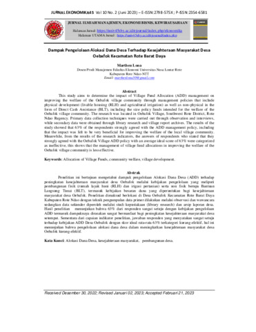 Marthen, Lona (2023) Dampak pengelolaan alokasi dana desa terhadap kesejahteraan masyarakat desa Oebafok Kecamatan Rote Barat Daya. Ekonomika45, 10 (2). pp. 12-20. ISSN 2354-6581