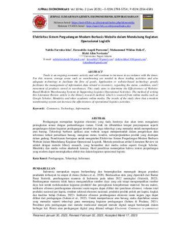 Nabila, Farraha Isha and Farasabila, Angeli Purnomo and Muhammad, Wildan Dzikri and Rizki, Alim Novianto (2023) Efektivitas sistem pergudangan modern berbasis website dalam mendukung kegiatan Operasional logistik. Ekonomika45, 10 (2). pp. 34-47. ISSN 2354-6581