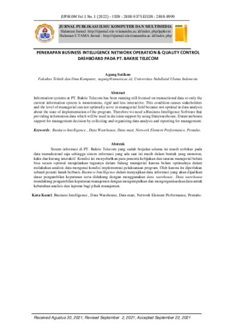 Agung, Sutikno (2022) Penerapan business intelligence network operation & quality control dashboard pada PT. Bakrie Telecom. Jurnal Publikasi Ilmu Komputer dan Multimedia, 1 (1): 3. pp. 22-32. ISSN 2808-9375