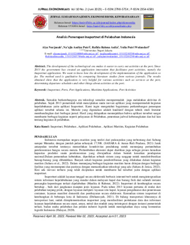 Alya, Nurjanah and Na’ajla, Andiza Putri and Rafida, Rahma Aulia and Yulia, Putri Wulandari (2023) Analisis penerapan inaportnet di pelabuhan Indonesia. Ekonomika45, 10 (2). pp. 147-154. ISSN 2354-6581
