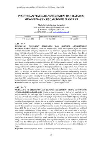 PEMODELAN PEMISAHAN ZIRKONIUM DAN HAFNIUM MENGGUNAKAN KROMATOGRAFI ANULAR. Zirkonium derajat nuklir dalam bentuk paduan logam merupakan material utama untuk kelongsong bahan bakar PLTN. Zirkonium juga digunakan sebagai bahan pelapis kernel UO2 dalam bentuk ZrC sebagai pengganti SiC pada elemen bahan bakar Reaktor Suhu Tinggi (RST). Hafnium sulit dipisahkan dari zirkonium karena mempunyai banyak kemiripan dalam sifat kimianya. Kromatografi anular adalah suatu alat yang dapat digunakan untuk pemisahan zirkonium dan hafnium hingga diperoleh zirkonium derajat nuklir. Oleh karena itu diperlukan pemodelan matematis yang dapat mendiskripsikan pemisahan zirkonium dan hafnium pada kromatografi anular yang berisi bahan isian resin anion dowex-1X8. Tujuan penulisan ini adalah melakukan simulasi pemisahan menggunakan model kesetimbangan dan koefisien perpindahan massa hasil penelitian. Pada penelitian ini digunakan Zr dan Hf dalam umpan, masing-masing 26 dan 1 g/l. Parameter tinggi resin (L), kecepatan sudut (ω) dan laju alir aksial (uz) divariasi untuk mengetahui pengaruh masing-masing parameter terhadap pemisahan Zr dan Hf. Hasil simulasi menunjukkan bahwa zirkonium dan hafnium dapat dipisahkan menggunakan kromatografi anular dengan tinggi resin (panjang bed) 50 cm, kecepatan alir superfisial 0,001 cm/det, kecepatan putaran 0,006 rad/menit dan diameter anular 20 cm. Pada kondisi tersebut diperoleh hasil zirkonium 10.303,226 g/m3 dan hafnium 12,324 g/m3 (ppm).