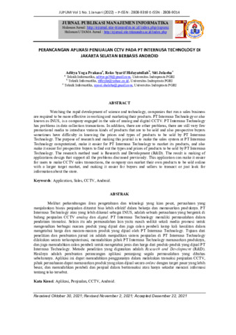 Aditya, Yoga Prakasa and Reko, Syarif Hidayatullah and Siti, Julaeha (2022) Perancangan aplikasi penjualan CCTV pada PT Internusa Technology di Jakarta Selatan berbasis android. Jurnal Publikasi Manajemen Informatika, 1 (1): 8. pp. 72-84. ISSN 2808-9359