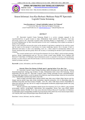 PT. Xpresindo Logistik Utama Cabang Semarang adalah perusahaan jasa yang bergerak di bidang ekspedisi/pengiriman barang yang berlokasi di Jalan Abdulrahman Saleh nomor 89a Semarang. Sistem pengolahan data kas pada PT. Xpresindo Logistik Utama Cabang Semarang bersifat sederhana/tunggal, sehingga tidak dapat diakses secara bersamaan oleh pihak lain yang berkepentingan (dalam hal ini pemasaran yang membutuhkan sejumlah uang untuk setiap truk). Masih terdapat perbedaan antara laporan jumlah uang jalan yang terdapat dalam laporan arus kas dengan laporan jumlah uang jalan dalam pendapatan (laporan pemasaran), hal ini dikarenakan jika ada tambahan uang jalan atau biaya lainnya (bongkar, mell, dll) -other) tidak dapat otomatis ditambahkan ke dalam data laporan laba rugi, dan hal ini sangat mempengaruhi keakuratan penghitungan jumlah laba yang diperoleh perusahaan. Metode penelitian yang digunakan adalah System Development Life Cycle (SDLC) yang meliputi perencanaan, analisis, perancangan, implementasi dan penggunaan. Sistem baru yang dibuat dengan menggunakan database MySQL Server dan sistem informasi berbasis Microsoft Visual Basic 6.0 Multiuser ini diharapkan dapat meningkatkan produktivitas kerja karena lebih efektif dan efisien karena dapat diakses oleh banyak pihak yang berkepentingan tanpa dibatasi jarak dan waktu.